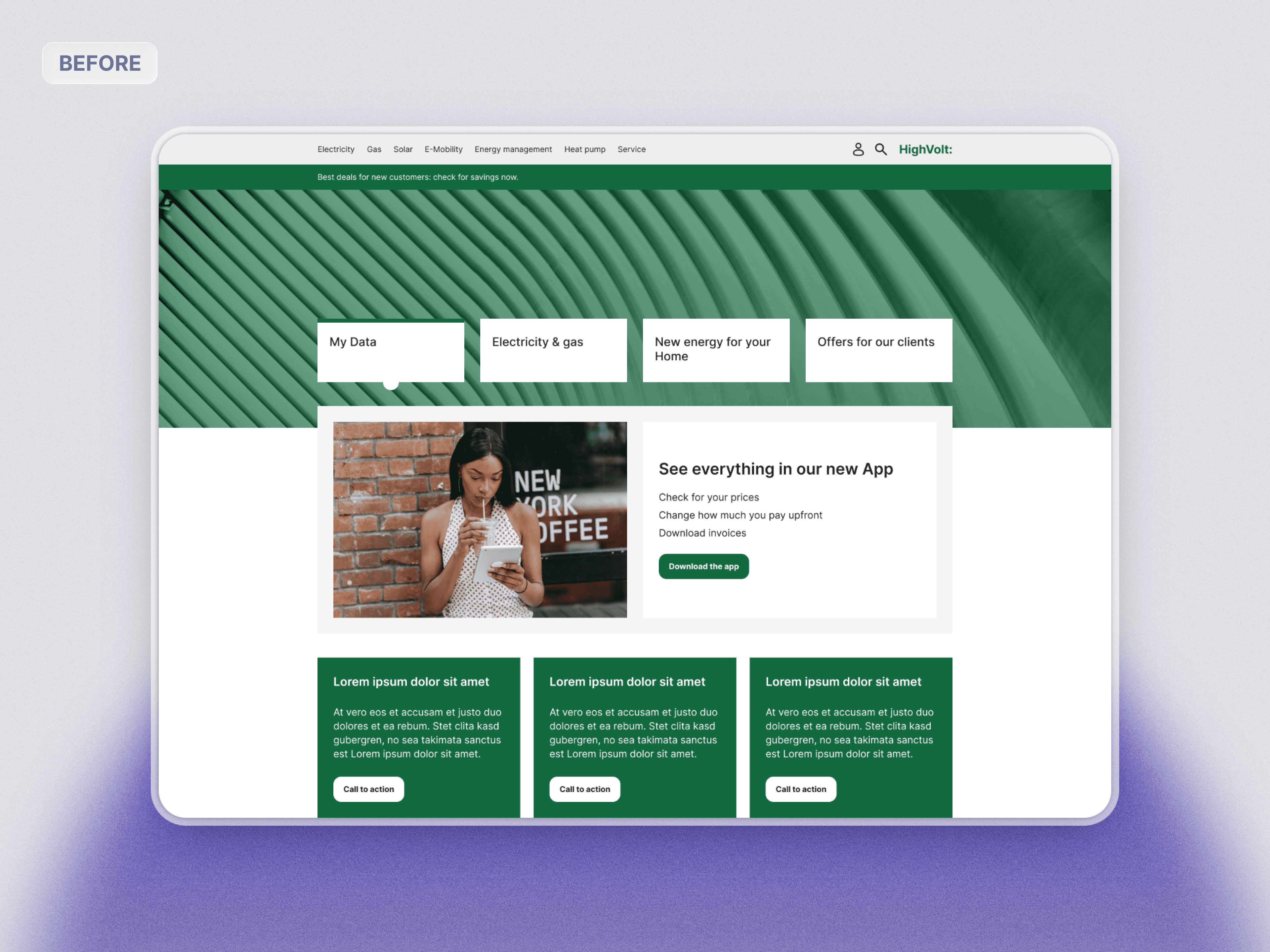 The Challenge: The existing account overview page was an unstructured collection of boxes, making it difficult for users to quickly complete primary tasks such as viewing contracts or bills. Simultaneously, it lacked a dedicated space to make customers aware of relevant new products (e.g., EV wallboxes, solar panels). The page was failing to meet both the users' need for efficiency and the company's business goals for cross-selling.